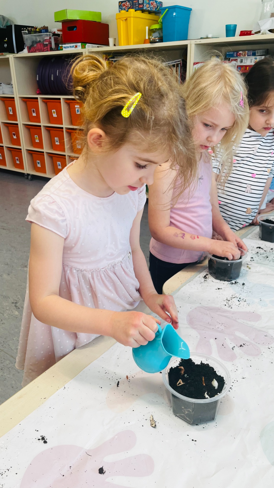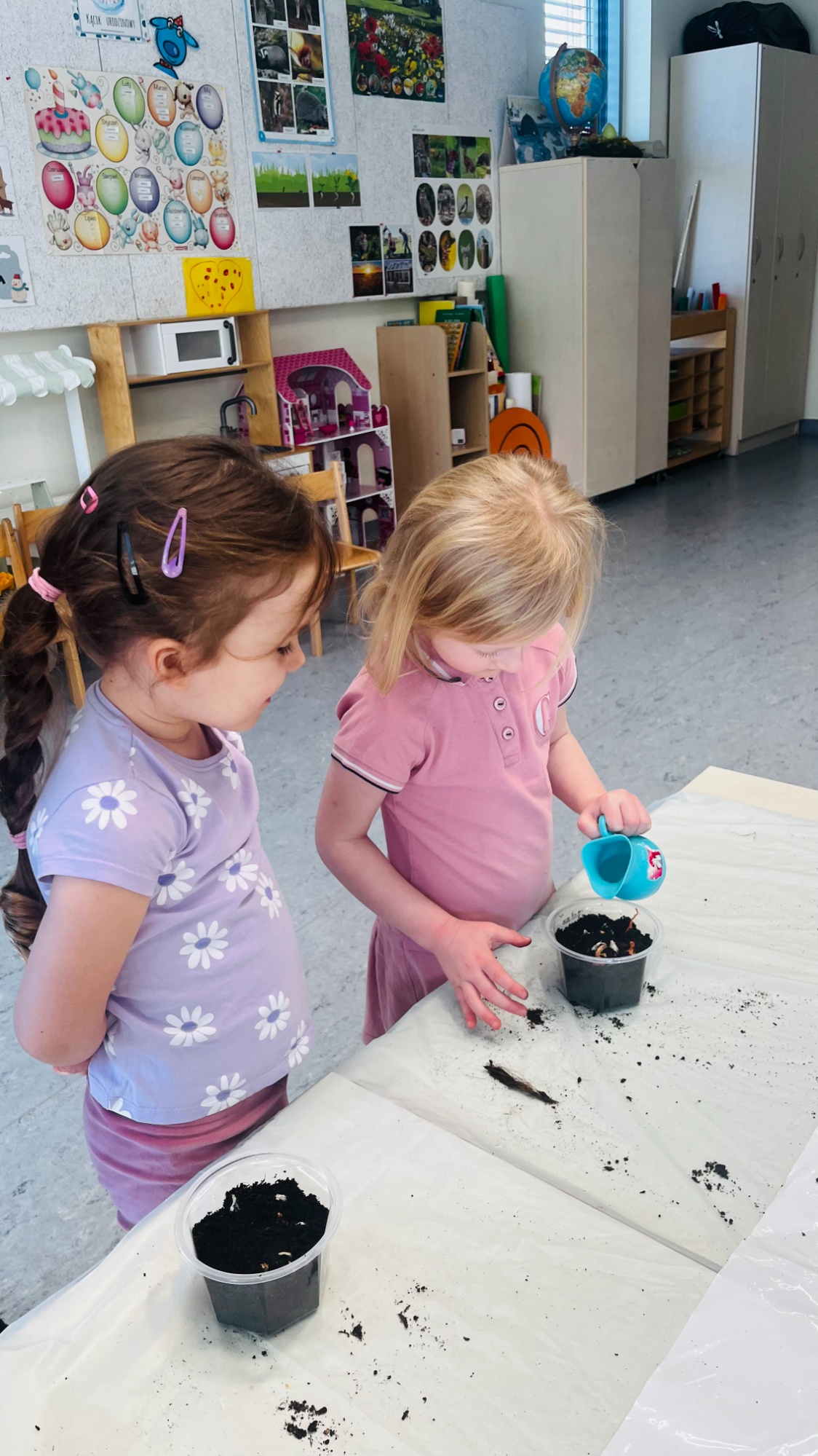 Każde dziecko samodzielnie przygotowało doniczkę z ziemią, a następnie posadziło w niej groszek oraz cebulkę dymkę. Dzięki codziennej pielęgnacji rośliny pięknie rosną i zdobią nasz parapet. Największą radość sprawia dzieciom możliwość obserwowania efektów swojej pracy – każdego dnia podczas śniadania chętnie sięgają po wyhodowany szczypiorek.
