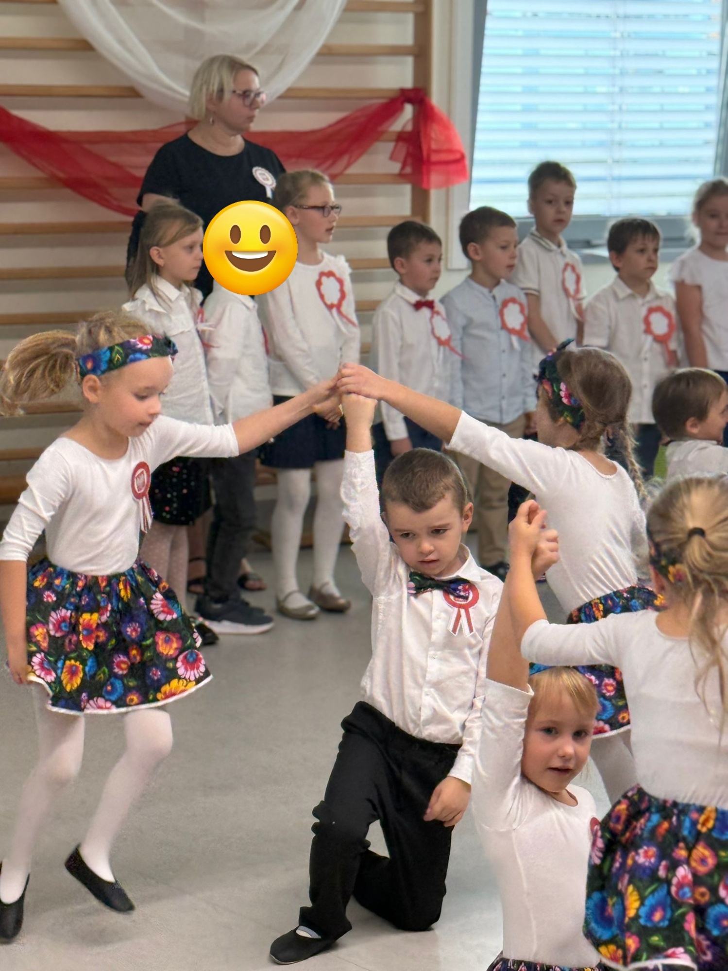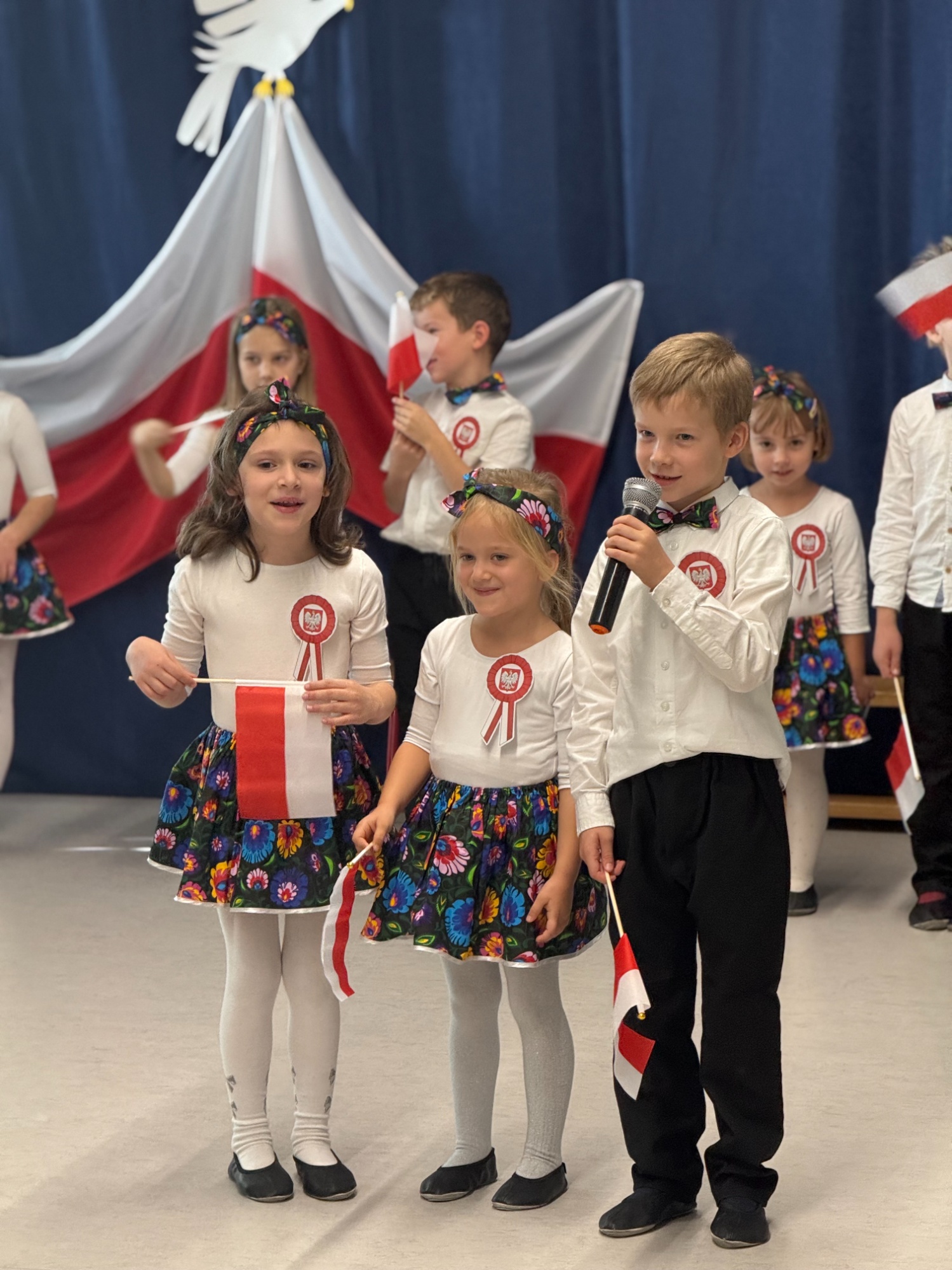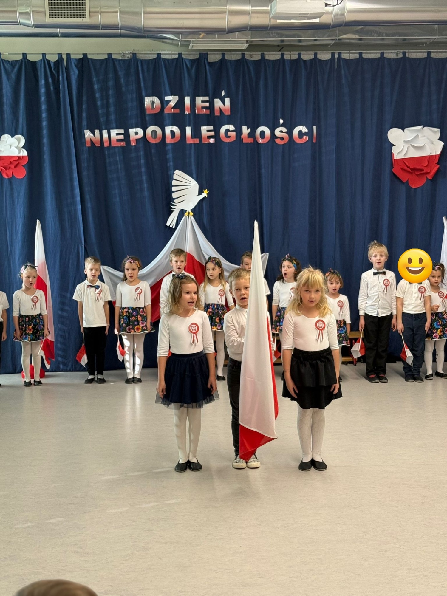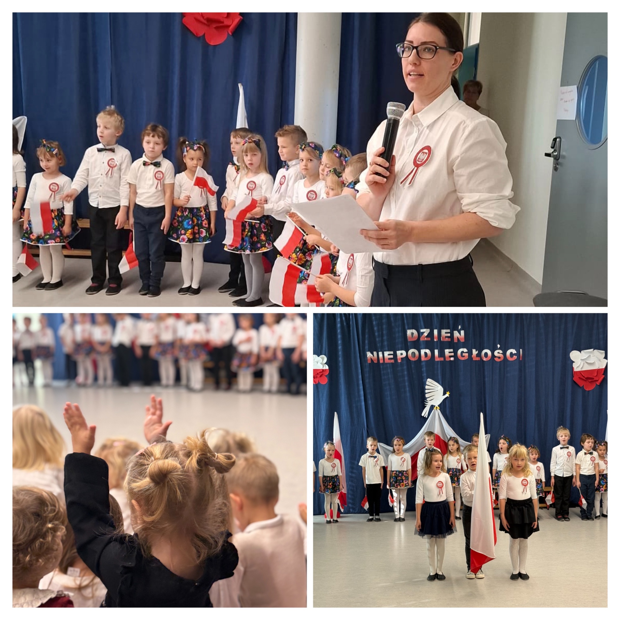 7 listopada o godzinie 11:11 w naszym przedszkolu odbył się apel z okazji Święta Niepodległości. Wystąpiły dzieci z grup 5-latków i 6-latków, a młodsze przedszkolaki z zainteresowaniem oglądały przedstawienie. W galowych strojach, wśród biało-czerwonych dekoracji i kotylionów, wspólnie odśpiewaliśmy hymn, tworząc piękną, patriotyczną atmosferę. Występ był naprawdę wzruszający, a mali artyści zostali nagrodzeni gromkimi brawami.